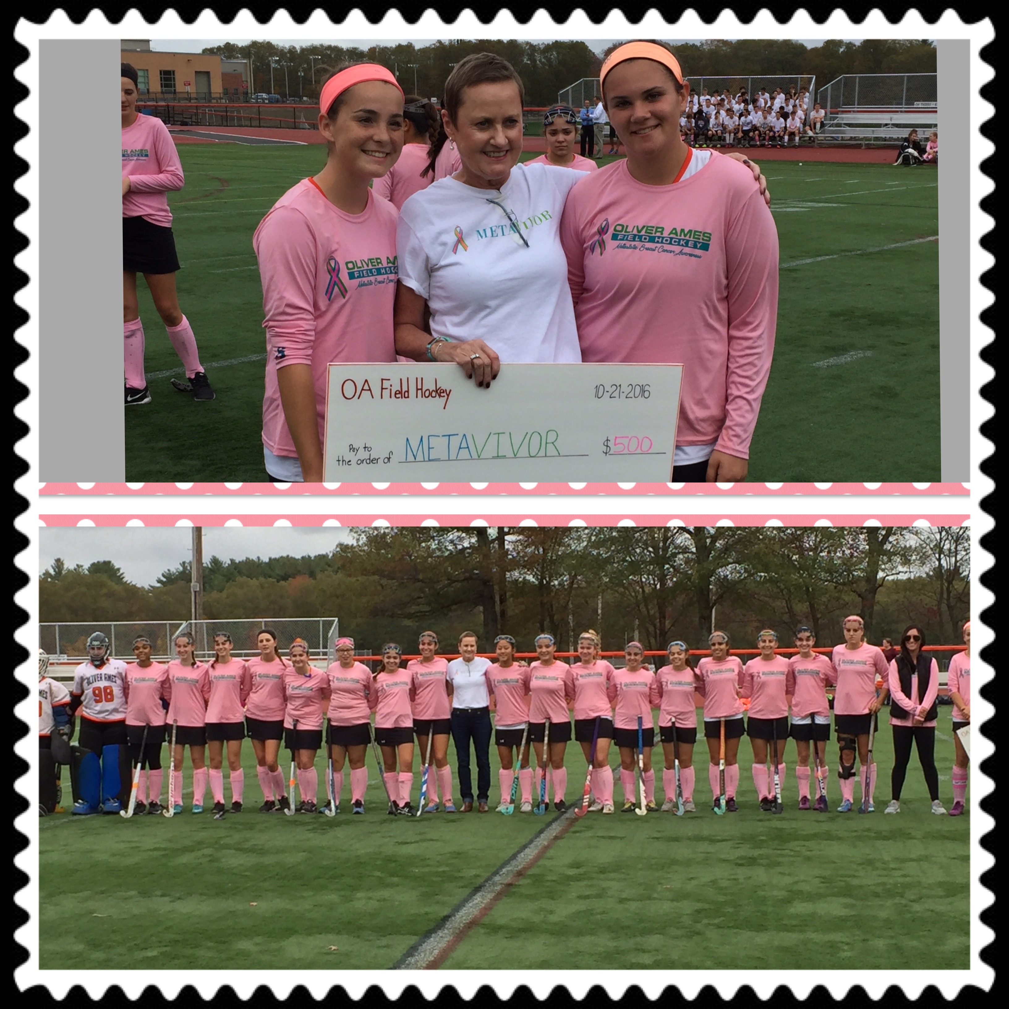 I was finally able to visit my advisory students! They are awesome and doing well in their senior year! I ended up spending most of the day at school chatting with faculty and students. Seeing kids makes me realize how much I miss them and how happy they make me. I ended that day with a presentation by the OAHS Field Hockey Team. imageThey sold lots of cookie dough–enough to buy team shirts that say “Metastatic Breast Cancer Awareness” with the Metavivor ribbon that they wear imagethrough the month of October. They had enough left over to donate $500 to Metavivor.org and they won the game!!!! They were cheered on by the OAHS Boys Soccer Team who also wanted in on the action as funny super fans! I went home feeling pretty euphoric after a tough week physically. I think I should get a job as a high school greeter and just walk around chatting all day. imageimage