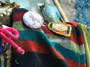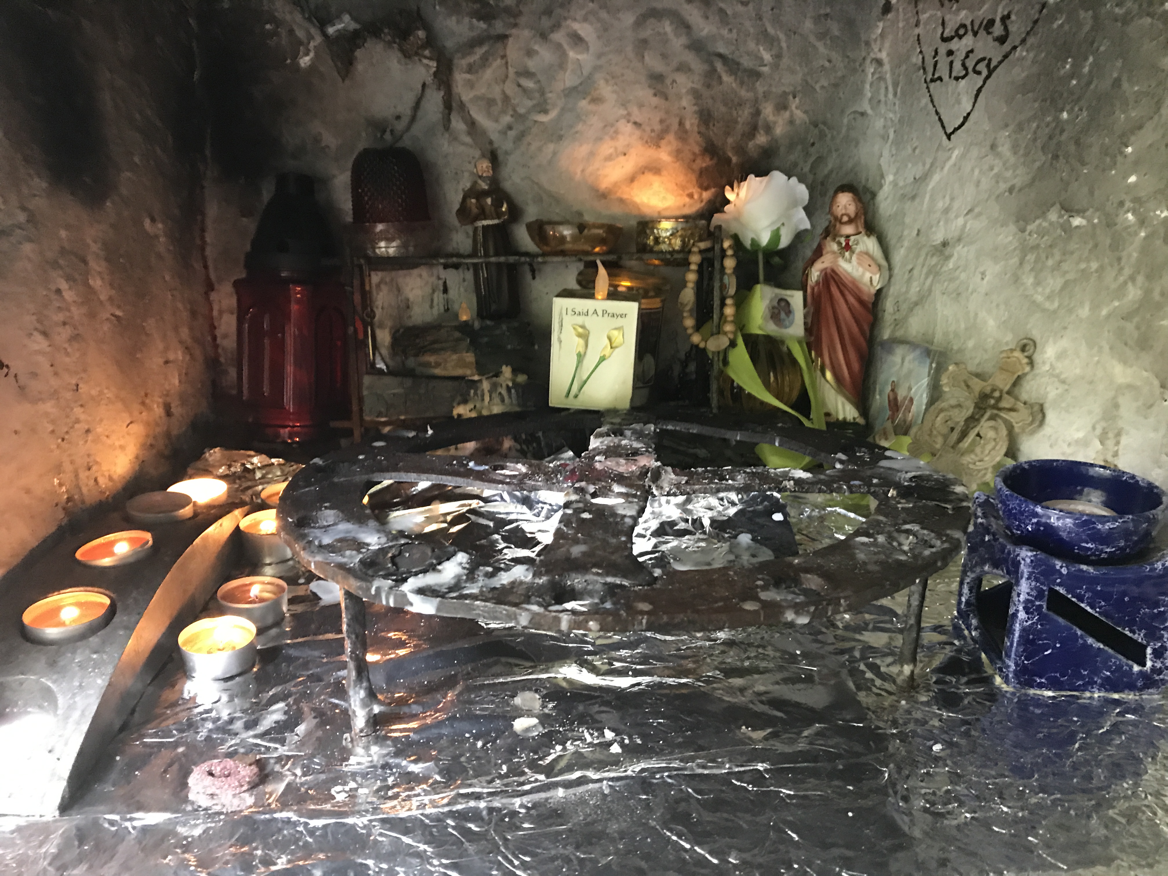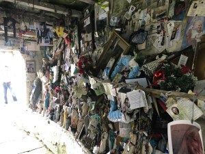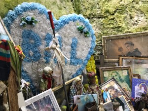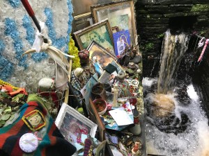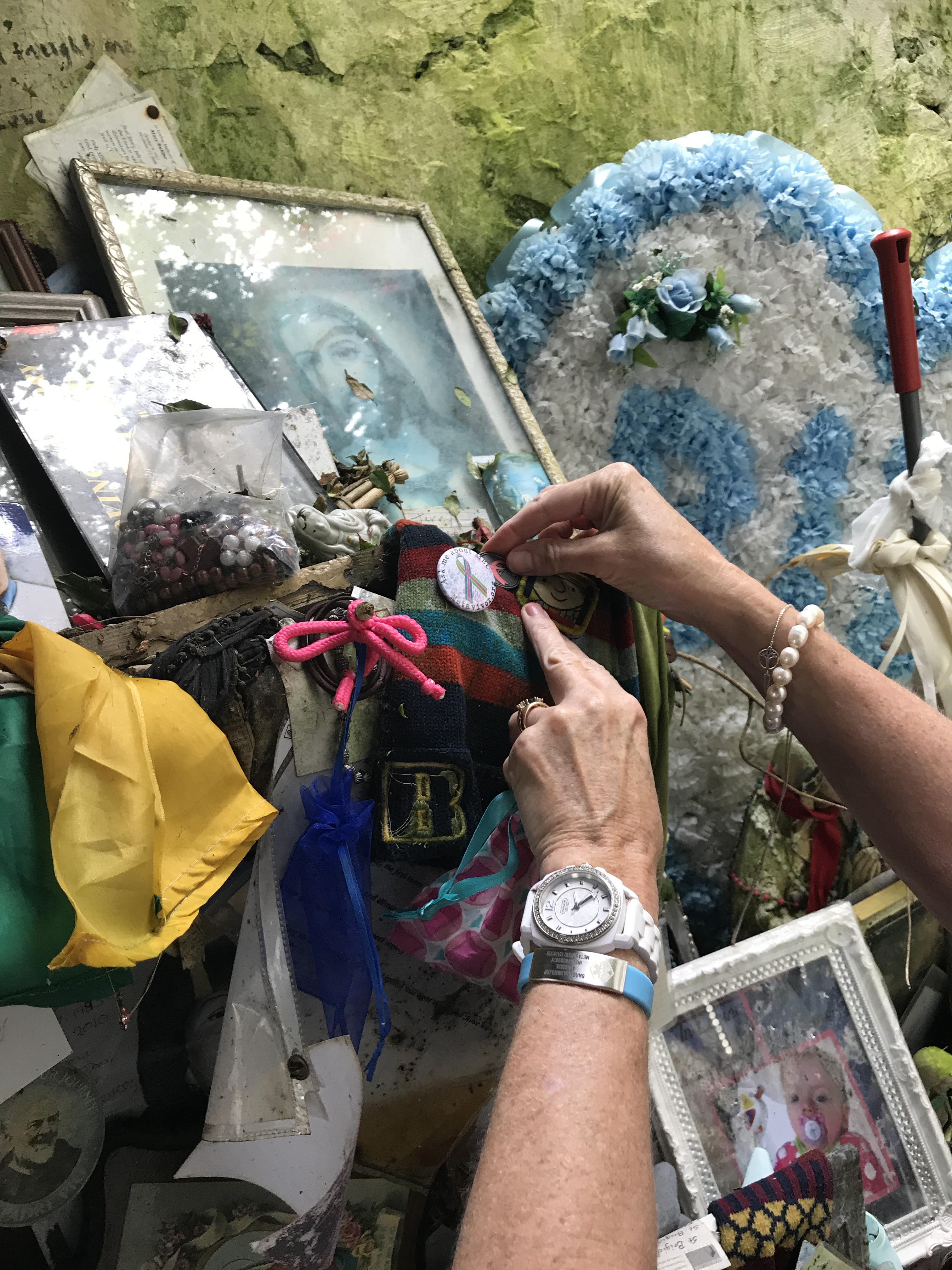 We arrived, the only pilgrims there that day. We hopped out to circle the statue, surrounded at her feet with stones on which people has written messages and pleas to her. Gradually we became aware of a small corridor in the cliff behind her. We entered the narrow hall to find hundreds of relics and mementos people had left of their loved ones– photos, beads, rosaries. A hole in the wall was lined with tin foil where pilgrims had lit small white votive candles to their deceased ones. Bits of cloth ripped from clothing hung from the branches above us in the small opening overhead. At the end of the slick corridor was the actual well, a square opening in the ground, foaming with brownish water from the river stream falling above. It was pretty moving to say the least and especially mysterious by virtue of us being the only ones there. Naturally curious, I felt compelled to crouch down and touch the water. Blessed water is healing right? OMG–as I leant over, my $700 eyeglasses went in the seemingly bottomless murky well! It was a panicked moment but I decided “oh F ^*^k, I gotta go in! “I laid on the slippery muddy floor and stuck my arm in up to my shoulder, prepared to dive in. After several long, frantic, minutes of routing around, I found them!!! Divine intervention? Yikes, soaked and shaken, I was so relieved I didn’t have to actually dive in. Laughing, Tim ran for water to wash off my glasses and vest. Even this did not stop me from adding my METAvivor pin and placing a token coin in the